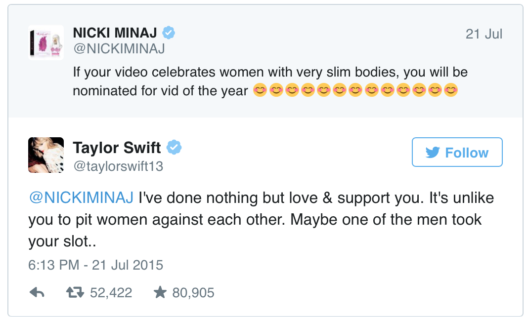artists, but don’t get recognized for it. Taylor takes offense to one specific Tweet (probably because her video for “Bad Blood” was nominated for Video of the Year), and goes on the defensive, accusing Nicki of pitting women artists of color against white women artists.