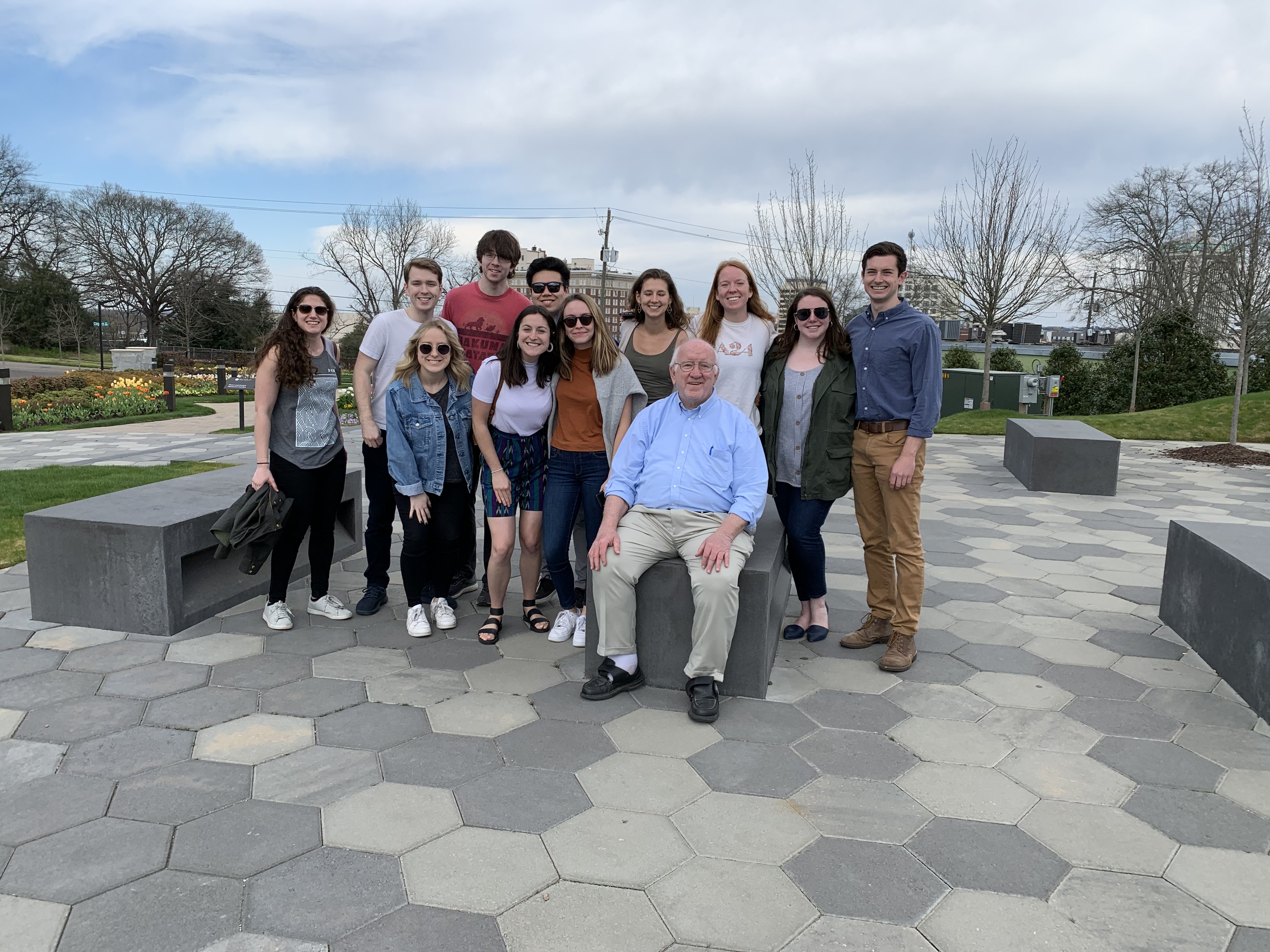 The group outside the memorial square at the National Memorial for Peace and Justice. From left to right: Back row: Becky Powell, Trenton Bonk, Dan Lucca, Guodong Fu, Julia Varoutsos, Rosie Tootell, Laura Robinson, Ryan Kenney Front row: Devon Sanders, Evelyn Jackson, Hannah Carlson, Fr. Fred Enman