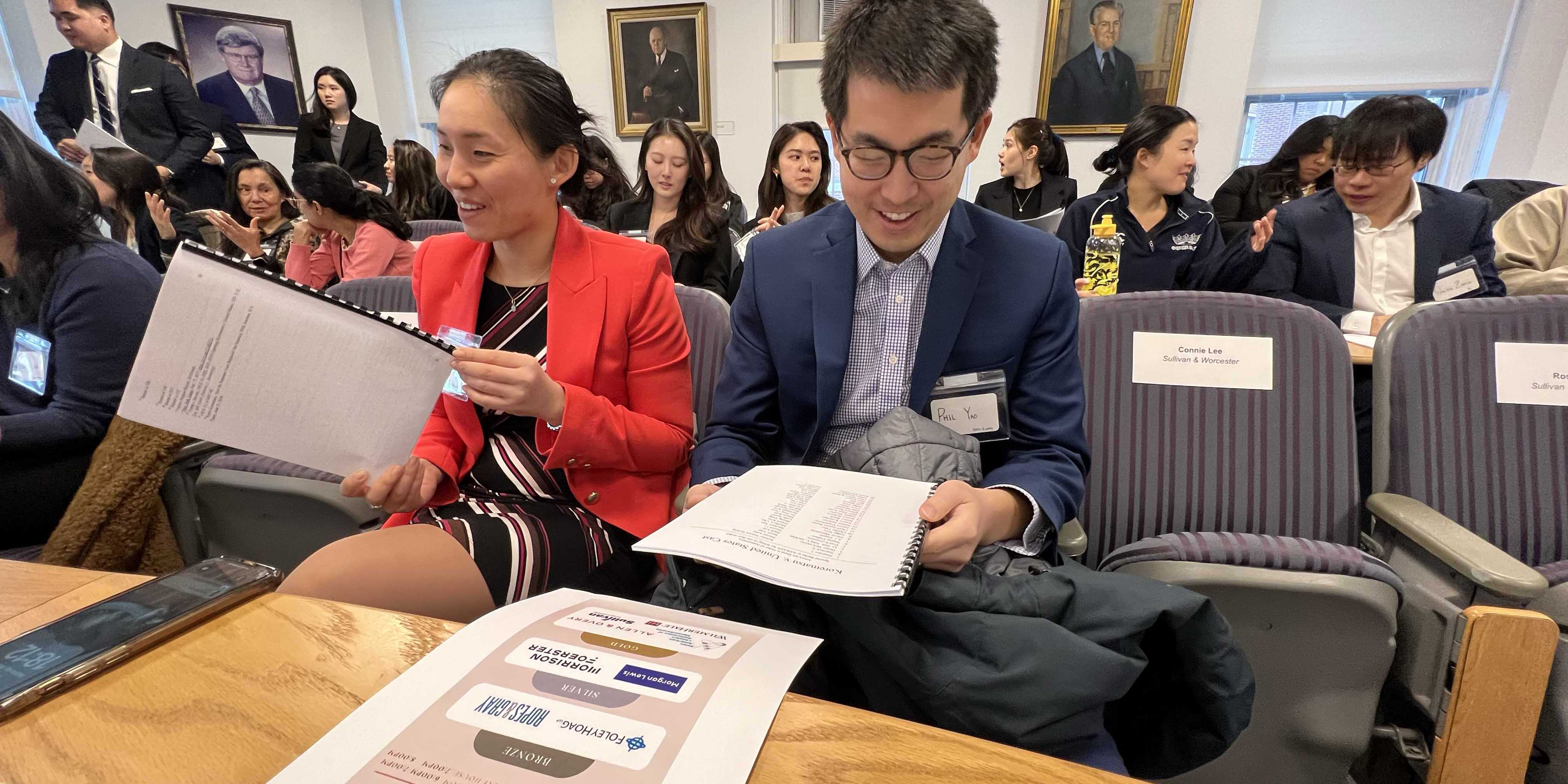 Everyone put their trust into the APALSA E-board, even though this was the first time we had pulled together an event of this nature. Behind the scenes, the board worked incredibly hard to make it all happen. We reached out to AABANY for permission to use the script, and AALAM for preliminary sponsorship and aid in kickstarting our fundraising efforts for this event. We had to account for the costs of food and drinks during the networking event, as well as the cost of making and binding scripts, props such as judge’s robes, and gifts for attendees. We reached out to over twenty different law firms in Boston, asking them if they would be amenable to sending over attorneys as well as a monetary support to help fund the event.