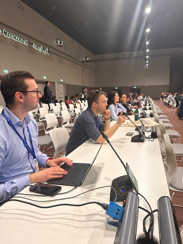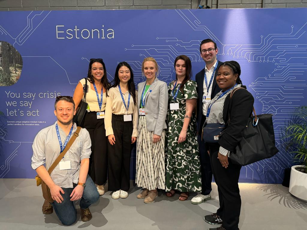 We arrived at Dubai’s Expo City by 8 am to receive our UN badges. COP28 consists of two separated areas: the Blue Zone and the Green Zone. The Green Zone is open to the general public and consists of exhibitions by civil society and businesses. The Blue Zone is the secure, UN-controlled area, where only official delegates are permitted to enter. This is where negotiations happen. Our observer status permitted us nearly unfettered access to the Blue Zone, with only a small number of closed-door meetings off limits to us. We began right away with our first meeting with representatives from Estonia.