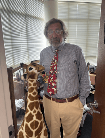 I had a student named Catherine. She was really crunchy-granola (outdoorsy). I asked her “what does your mother call you?” She said, “Cat.” I said, “I don’t like cats, I like dogs.” My favorite animal is the giraffe. After class, I checked with her, “You mind if I call you “Giraffe?” Students in that section gave me this (giraffe plushee) when the class ended and I couldn’t take it home because my wife didn’t like it. When I met her mother at graduation, she said, “I’m Giraffe’s mother.”